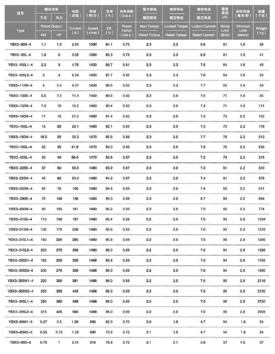 YBX3系列高效率隔爆型三相異步電動(dòng)機(jī)額定電壓380V、660V、380/660V,額定頻率50HZ,防護(hù)等級(jí)IP55,冷卻方法IC411,采取F級(jí)絕緣,滿載溫升按B級(jí)考核,適用于煤礦井下(非采掘工作面)及