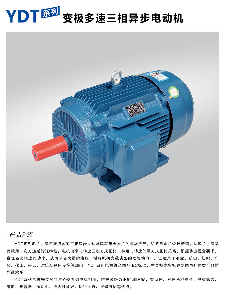 YDT系列風機、泵用變極多速三相異步電動是國家重點推廣的節能產品。該系列電機設計新穎,按風機、泵類負載為二次方遞減轉矩特性:電機功率與轉速三次方成正比,轉矩與轉速的平方成正比關系,根據轉速配套要求,合理匹配相應的功率,從而節省大量的能源,堪稱風機負載類型的理想動力。廣泛運用于冶金、礦山、紡織、印染、化工、輕工、建筑及民用設施等部門。YDT系列電機符合國際IEC標準,主要技術指標達到國內外同類產品的先進水平。